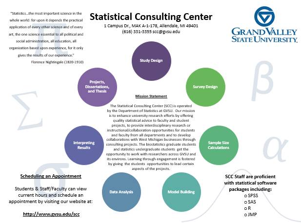 The Statistical Consulting Center (SCC) is operated by the Department of Statistics at GVSU. The Center is located in A1-184 Mackinac Hall on the GVSU Valley Campus. Our mission is to enhance university research efforts by offering quality statistical advice to faculty and students, to provide interdisciplinary research or instructional/collaboration opportunities for students and faculty from all departments and to collaborate with West Michigan businesses through consulting projects. Research is increasingly data-driven, and we are available to answer your statistics and analysis questions through in-person or virtual consultations. To make an appointment or an inquiry, please click Options for Consultation.