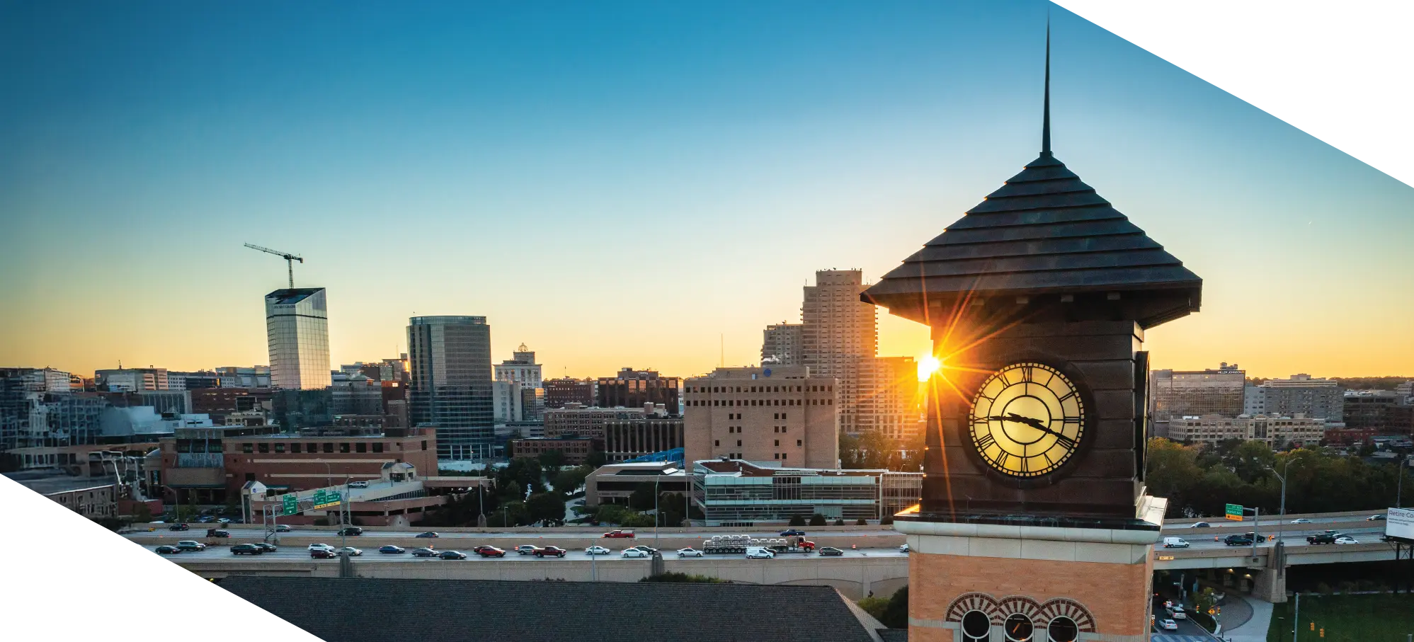 Sunrise glows through the Beckering Carillon Tower, casting light over Grand Rapids and the Pew Grand Rapids Campus.