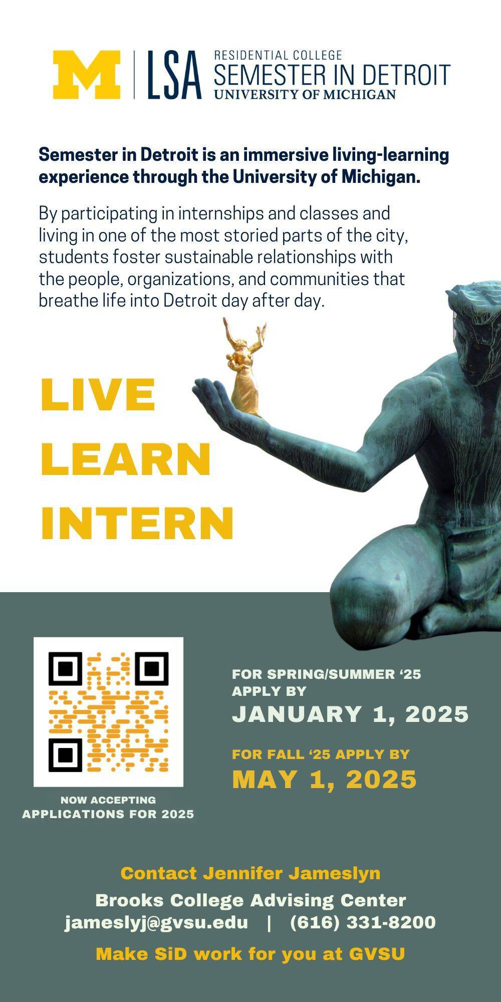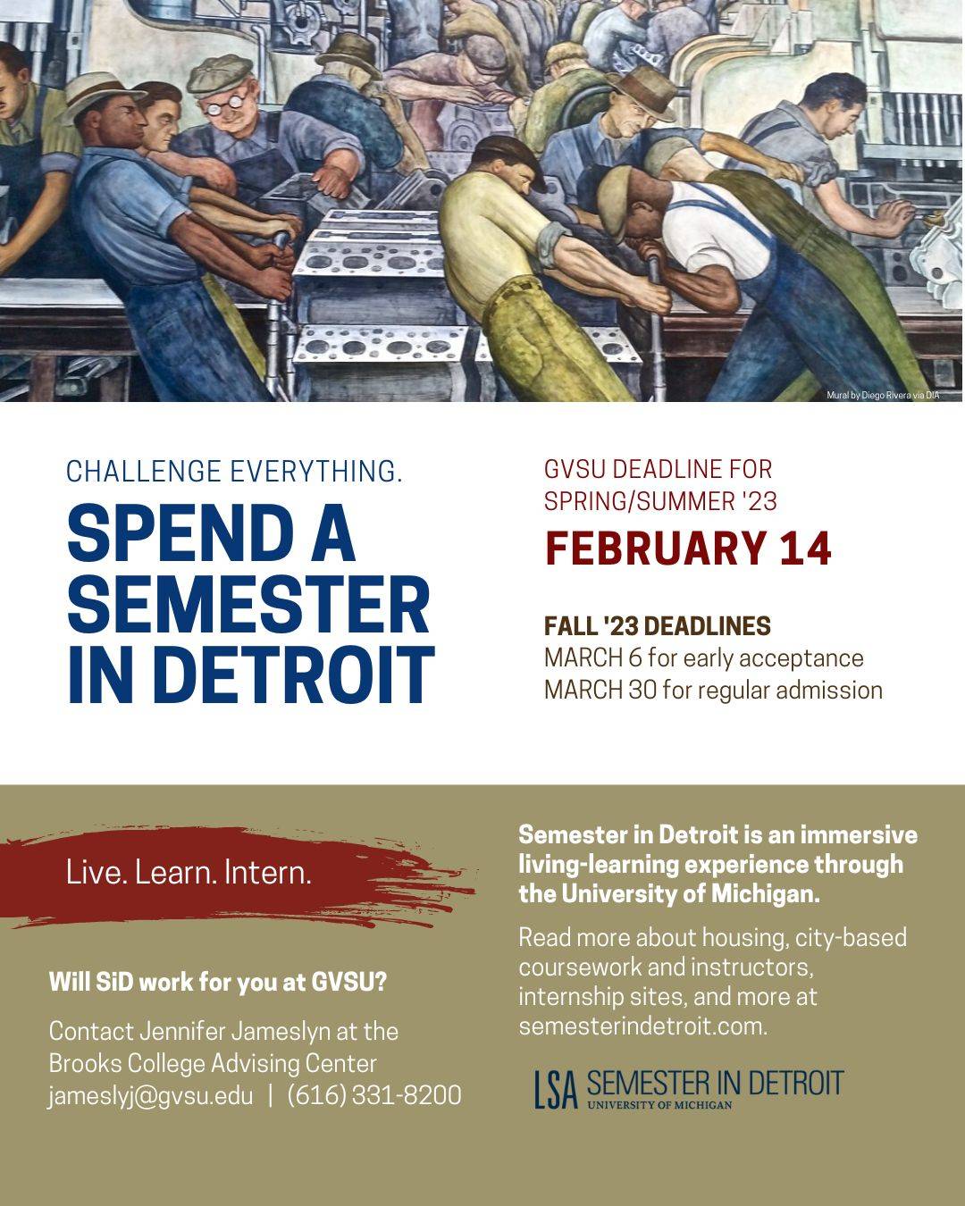 Grand Valley State University is excited to continue a partnership with the University of Michigan's Semester in Detroit (SID). This program provides students in any major the opportunity to have a rich and unique learning experience, earning 12-15 undergraduate credits, while living in Detroit. This program is housed in Brooks College of Interdisciplinary Studies.