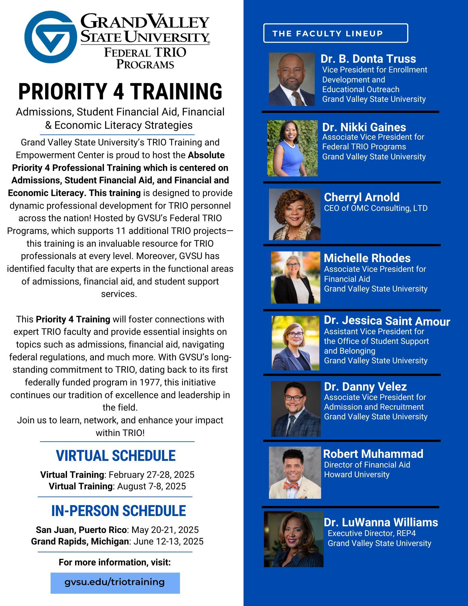 The GVSU TRIO Training and Empowerment Center, a federally funded program, provides professional development opportunities for TRIO project staff across the country. Funded through a grant from the U.S. Department of Education, the Center hosts online webinars and in-person training sessions facilitated by nationally recognized experts in TRIO project management and service delivery. These events emphasize Absolute Priority #4: Student Financial Aid, Admissions, and Financial/Economic Literacy.