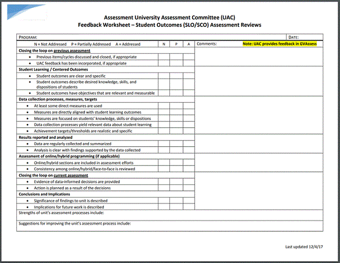These offline versions of the UAC review rubrics may be useful as units refine their assessment activities.