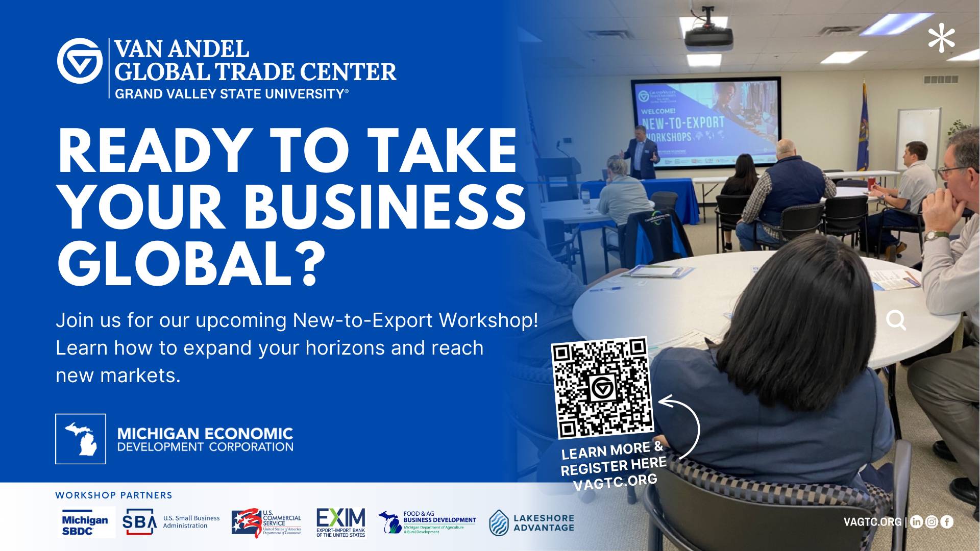 Once a quarter, Grand Valley State University’s Van Andel Global Trade Center (VAGTC)—sponsored by the Michigan Economic Development Corporation—will host a New-to-Export Workshop. For just $15, small and medium-sized businesses (SMEs) can gain critical, foundational export knowledge.