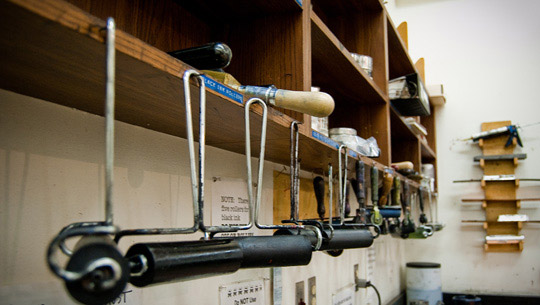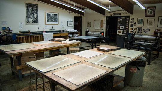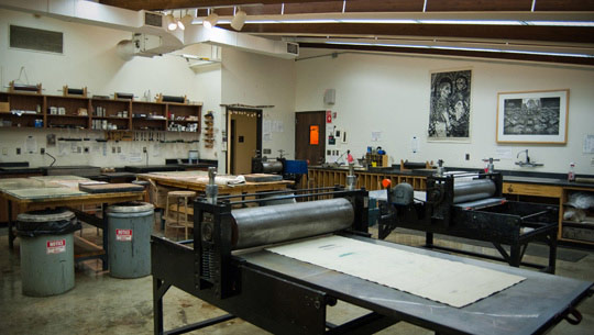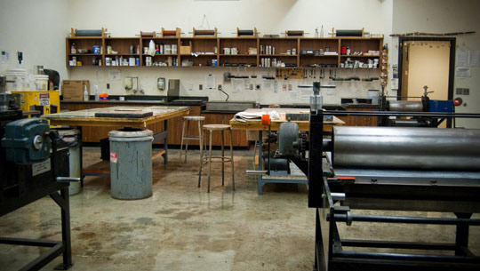 The spacious printmaking facilities offer students the tools necessary to work in diverse printed media. The studios are equipped so that students can work in relief, intaglio, digital, screen printing, and photo-based methods. The department’s papermaking equipment is also located in these studios. Majors pursuing a BFA in this emphasis area have individual workspaces adjacent to the main printmaking classrooms.