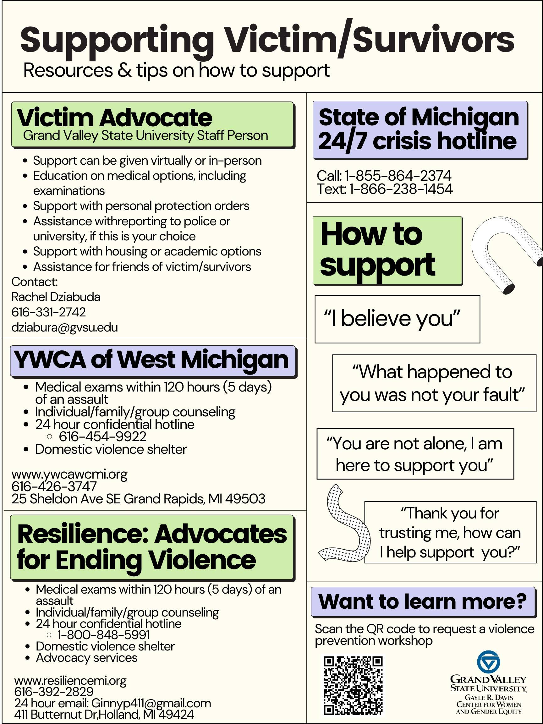 - Take care of yourself, too. It is normal to feel an array of emotions when you learn someone you care about has experienced violence. Many agencies that offer free services to victims also offer free services to family and friends affected by vicarious trauma after an incident of violence. The GVSU victim advocate is here to support anyone who has been affected by gender based violence.