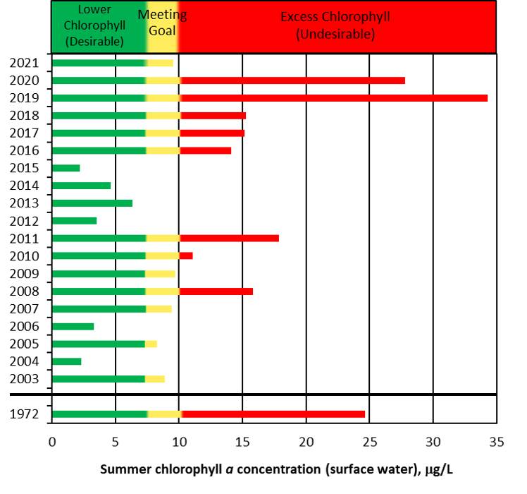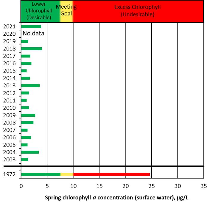Chlorophyll a is the green pigment found in photosynthetic algae. Chlorophyll a serves as a proxy for the amount of algal biomass present in water. The chlorophyll a dashboard was created by calculating seasonal average chlorophyll a concentrations measured in the surface water of the 6 long-term monitoring stations. Historical data collected by the US EPA (Freedman et al. 1979) are included as a reference point for historical conditions.