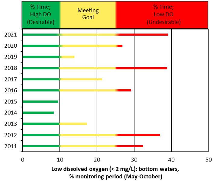 Well-oxygenated water is critical to the healthy functioning of aquatic ecosystems, including sustaining populations of fish and bottom-dwelling organisms, such as insects, worms, mollusks, and snails. In overly-productive (i.e., eutrophic) lakes, dissolved oxygen (DO) can become depleted in the bottom waters, particularly during summer months. The DO dashboard was created by calculating the percentage of time during the annual monitoring period (May-October) that the daily average DO was less than 2 mg/L in the bottom waters at the Muskegon Lake Observatory buoy.