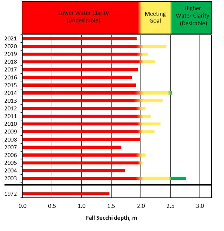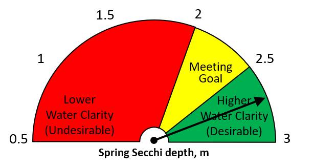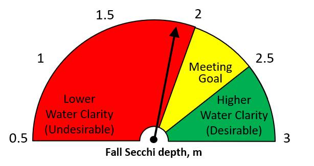 In 2024, the status for Secchi depth qualified as the Meeting Goal category for spring and Undesirable in summer and fall, likely due in part to the summer 2024 algae bloom. Overall in 2024, the annual mean Secchi disk depth was 1.89 m, representing a slightly shallower depth of water clarity from 2023 (2.01 m).