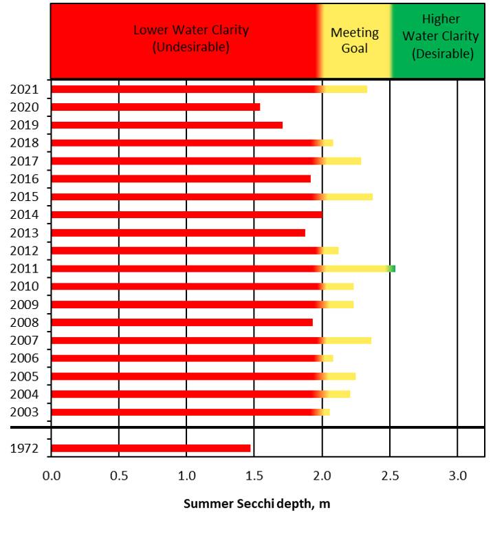 Secchi disk depth is an estimate of water clarity, measured using a standard black and white disk. Low water clarity can be the result of algal biomass, suspended particulate matter, or natural staining of the water. The Secchi depth dashboard was created by calculating seasonal average Secchi disk depths measured at the 6 long-term monitoring stations. Historical data collected by the US EPA (Freedman et al. 1979) are included as a reference point for historical conditions. Unlike TP and chlorophyll a, the larger (i.e., deeper) the Secchi depth number, the better the water quality.