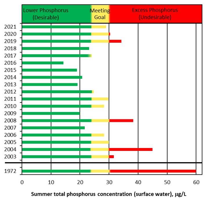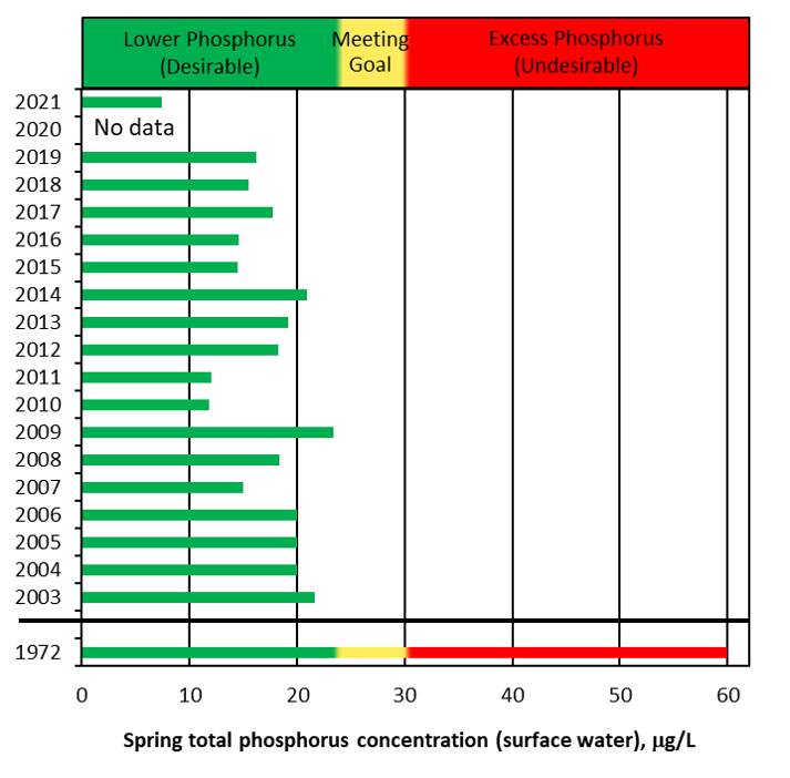 As one of the key nutrients that fuels algal growth, phosphorus concentration can indicate the potential for a lake to sustain undesirable algal blooms. The phosphorus dashboard was created by calculating seasonal average TP concentrations measured in the near-surface water of the 6 long-term monitoring stations. Historical data collected by the US EPA (Freedman et al. 1979) are included as a reference point for historical conditions.