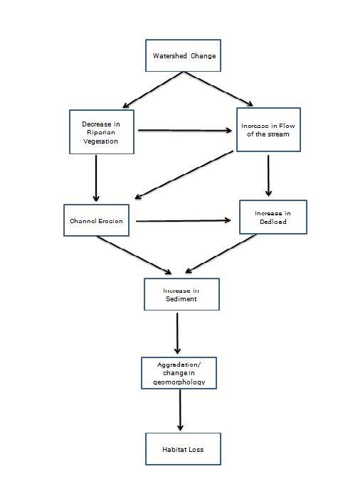 The filling of microhabitats of the stream by the sedimentation and loss of woody debris are detrimental to biota of the creek. Amphipod populations decreased by 94% from the stream section above the I-96 highway to Elizabeth Avenue (near the confluence of Grand River). Episodic high flow events also causes channel erosion and changes the morphology of the creek that negatively affects the habitat. Altered hydrology in Indian Mill Creek results in high bedload sediment transport (6680 kg/d) and bank erosion (>60 cm) in the lower reach of the stream and continual deposition of sediment in the channel (aggradation). Aggrading conditions (15-20 cm accumulation using scour chains) were observed at Richmond Park and below the confluence of Indian Mill Creek and Brandywine Creek. Since the temperature is within the cold-moderate category, our results suggest that sediment transport and deposition are the main stressors impacting the coldwater classification.