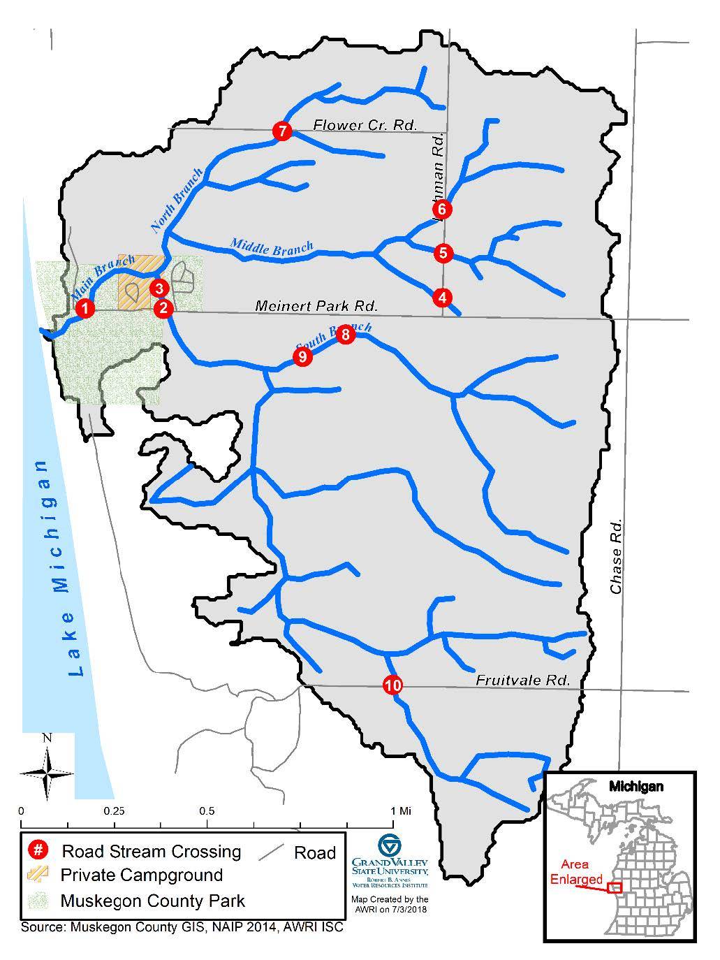 Little Flower Creek (LFC) is a designated coldwater stream located in northwest Muskegon County with a watershed area of 1500 ac (6km2). LFC consists of three branches (North, Middle, and South) converging as the Main Branch which flows through Meinert Park. It discharges to Lake Michigan at the outlet of an interdunal wetland on the public beach. Meinert Park is a popular recreational area covering 182 acres of dune land. The Land Conservancy of West Michigan recently acquired 31 additional acres to add to the adjacent public property to the north, the Flower Creek Dunes Nature Preserve. Excessive levels of E. coli from agricultural runoff and septic systems discharging to LFC have resulted in beach closures at Meinert Park (AWRI 2017). Agriculture and road runoff have resulted in streambank erosion and sedimentation. This is degrading fish and macroinvertebrate communities. Due to LFC’s importance to the local community and the Great Lakes, concerns have been raised regarding LFC’s ecological health and the potential impact of current and future development on the biodiversity of the watershed. The objective of this study was to conduct bioassessments, road stream crossing surveys, and erosion surveys to discern the magnitude of impairment and to identify critical areas for management. The assessment specifically included the following elements: