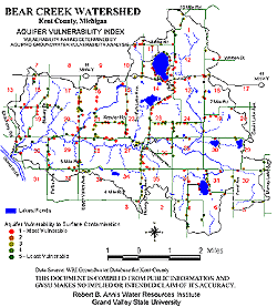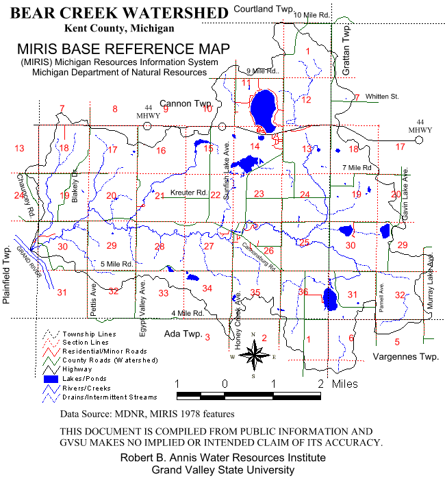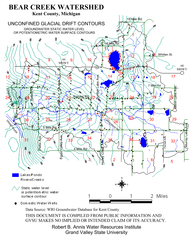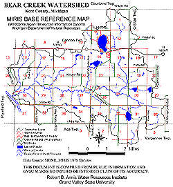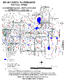 The Bear Creek Watershed is liberally dotted with bodies of water (See Figure 2, p. 9). The most prominent of these is Bear Creek itself which traverses the entire area on its east to west course toward the Grand River. The most prominent named tributaries of Bear Creek are Armstrong, Stout and Waddell Creeks - all three located at or near the western boundary of the watershed and generally flowing in a northeast to southwesterly direction into Bear Creek.