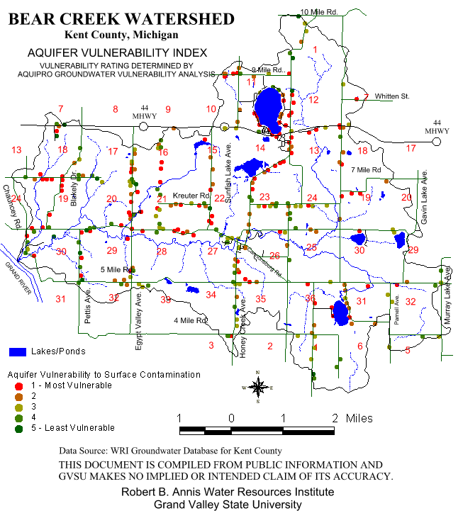 Wells provide all of the water for residential, commercial, and industrial use within the watershed. Most of these wells draw from the confined glacial drift aquifer which is separated from the ground surface by a confining layer of clay or rock. Some wells draw from the unconfined aquifer which is more vulnerable to contamination from the ground surface. Figure 7 identifies water well locations and the static water level of unconfined glacial drift aquifers. Figure 8 identifies the relative risk of groundwater contamination of wells in the area. As is evident, the sites at greatest risk are not concentrated in one location, but are scattered throughout the watershed.