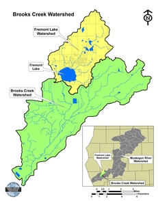 The Fremont Lake Watershed is 12,300 acres (19.2 square miles) in size and is located in the Brooks Creek Watershed, which is part of the Muskegon River Watershed. The watershed is in Newaygo County and encompasses portions of Sherman, Dayton, Sheridan, and Garfield Townships, and the City of Fremont. The watershed contains 977 acres (1.5 square miles) of lakes and ponds and 20.2 miles of streams and drains. The streams that flow into the lake include Lorden Lake Creek, Brooks Creek, Daisy Creek, Fremont Drain, Unnamed Drain, McDonald Drain, and Pell Drain. Fremont Lakes outlet is Brooks Creek, which is located on the south side of the lake.