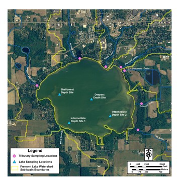 In addition to the lake, one sampling location was established on each tributary that flows into Fremont Lake (Lorden Lake Creek, Brooks Creek, Daisy Creek, Fremont Drain, McDonald Drain, Pell Drain, and an unnamed drain). The tributary sites were positioned at the furthest downstream point before entering the lake. This ensured that the samples taken at these sites were a good representation of the water quality and nutrient loads contained in each tributary (and by extension all the lands within that tributaries sub-basin) prior to its entry and mixing into the lake.
