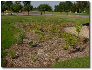 A mulch of shredded hardwood is an integral part of your rain garden. It keeps the soil moist and ready to soak up rain, and makes your garden low-maintenance. Maintain your garden for the first couple of years by: