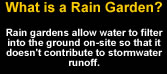 The purpose of a rain garden is to protect and improve the water quality in a watershed by managing storm water runoff. Rain gardens are bioretention systems that allow water to filter into the ground on-site so that it doesn't contribute to stormwater runoff. Increased infiltration of water helps remove contaminates such as oil, grease, and nutrients. It also reduces the volume of water flowing overland that will eventually enter a nearby stream, ditch, or storm sewer system.