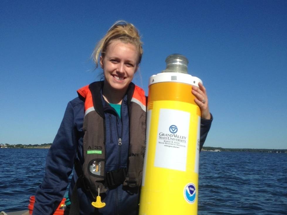 Katie Knapp, '19, estimated lake metabolism using the Muskegon Lake Observatory with Dr. Bopi Biddanda. Katie teaches outdoor lessons at West Michigan Academy of Environmental Science.
