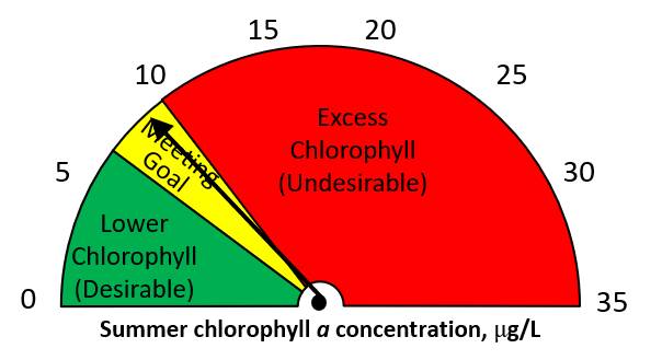Key water quality indicators were selected from these datasets to create a water quality dashboard for Muskegon Lake. The goal of the dashboard is to provide a visual representation of the current status and historical trends in Muskegon Lake water quality, by rating each indicator along a scale from desirable (green) to undesirable (red) conditions. Each scale also includes a category that indicates the water quality goal for the lake is being met (yellow).