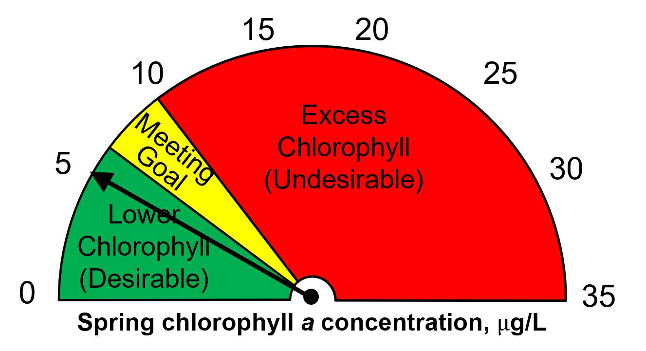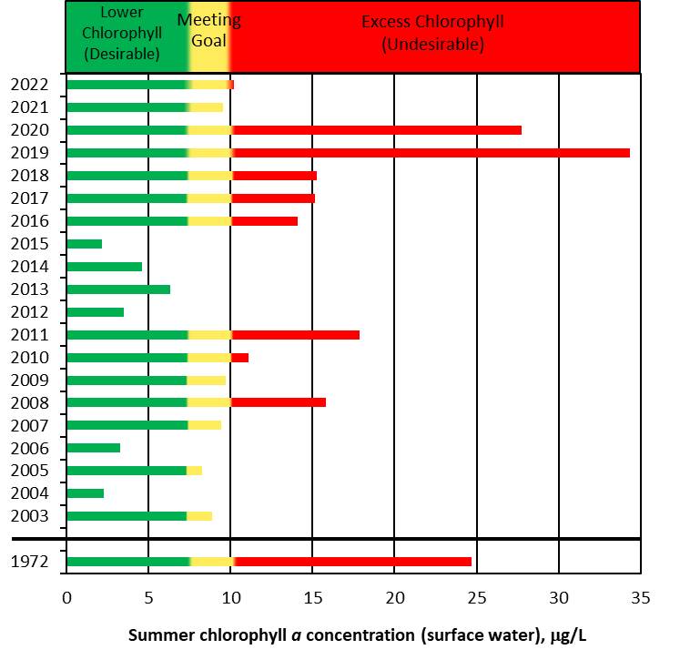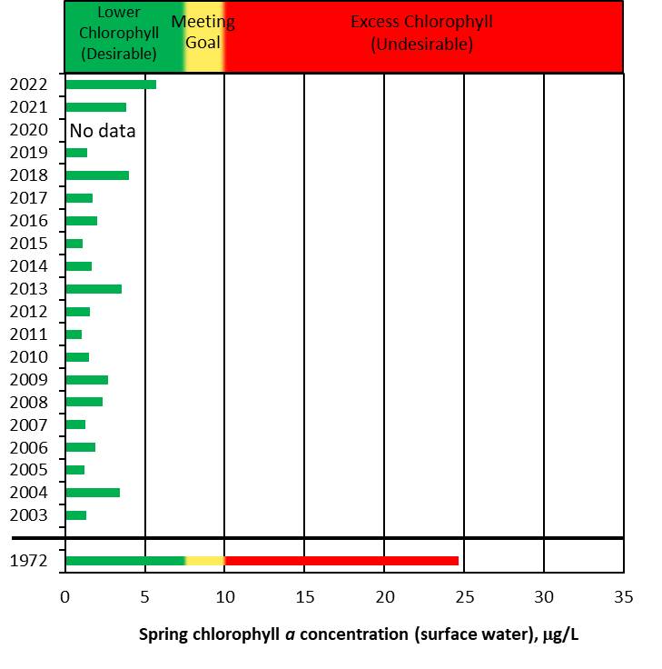 Chlorophyll a is the green pigment found in photosynthetic algae. Chlorophyll a serves as a proxy for the amount of algal biomass present in water. The chlorophyll a dashboard was created by calculating seasonal average chlorophyll a concentrations measured in the surface water of the 6 long-term monitoring stations. Historical data collected by the US EPA (Freedman et al. 1979) are included as a reference point for historical conditions.