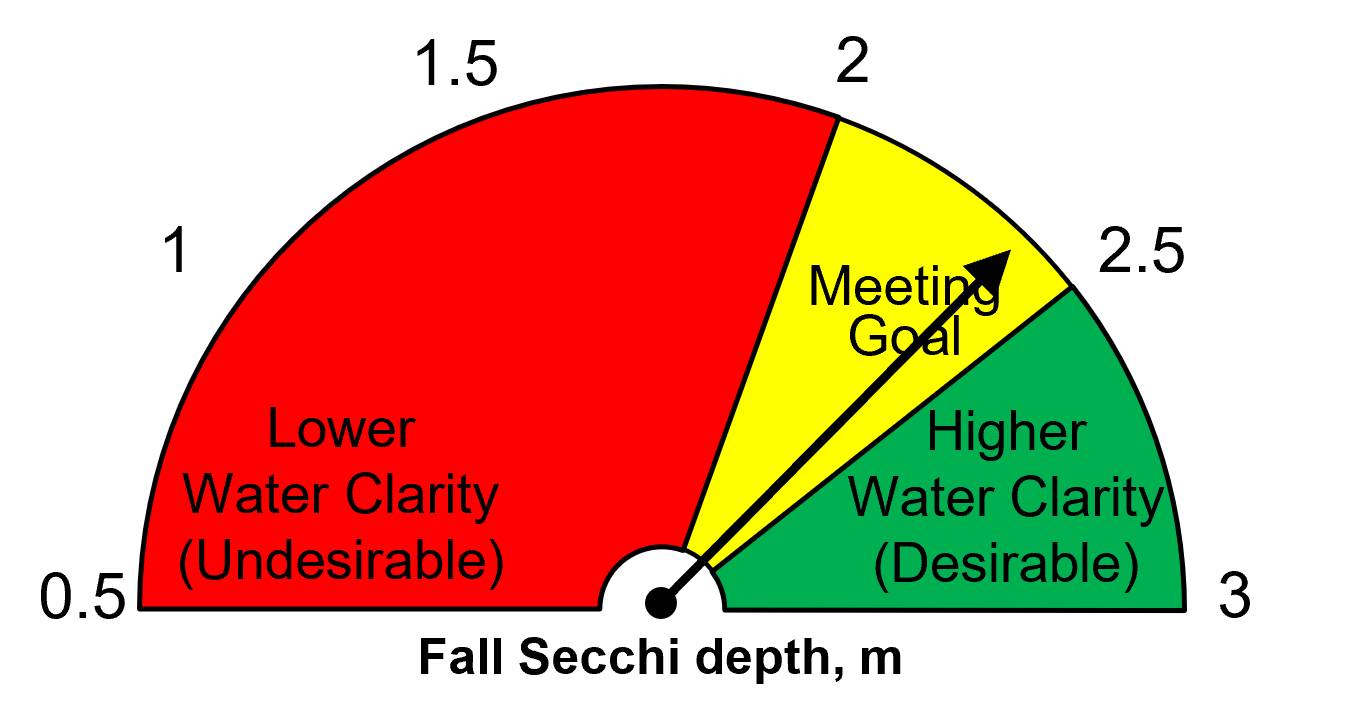 In 2024, the status for Secchi depth qualified as the Meeting Goal category for spring and Undesirable in summer and fall, likely due in part to the summer 2024 algae bloom. Overall in 2024, the annual mean Secchi disk depth was 1.89 m, representing a slightly shallower depth of water clarity from 2023 (2.01 m).