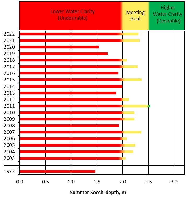 Secchi disk depth is an estimate of water clarity, measured using a standard black and white disk. Low water clarity can be the result of algal biomass, suspended particulate matter, or natural staining of the water. The Secchi depth dashboard was created by calculating seasonal average Secchi disk depths measured at the 6 long-term monitoring stations. Historical data collected by the US EPA (Freedman et al. 1979) are included as a reference point for historical conditions. Unlike TP and chlorophyll a, the larger (i.e., deeper) the Secchi depth number, the better the water quality.