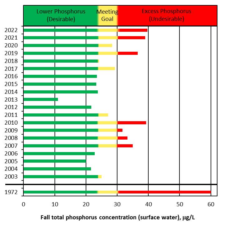 As one of the key nutrients that fuels algal growth, phosphorus concentration can indicate the potential for a lake to sustain undesirable algal blooms. The phosphorus dashboard was created by calculating seasonal average TP concentrations measured in the near-surface water of the 6 long-term monitoring stations. Historical data collected by the US EPA (Freedman et al. 1979) are included as a reference point for historical conditions.